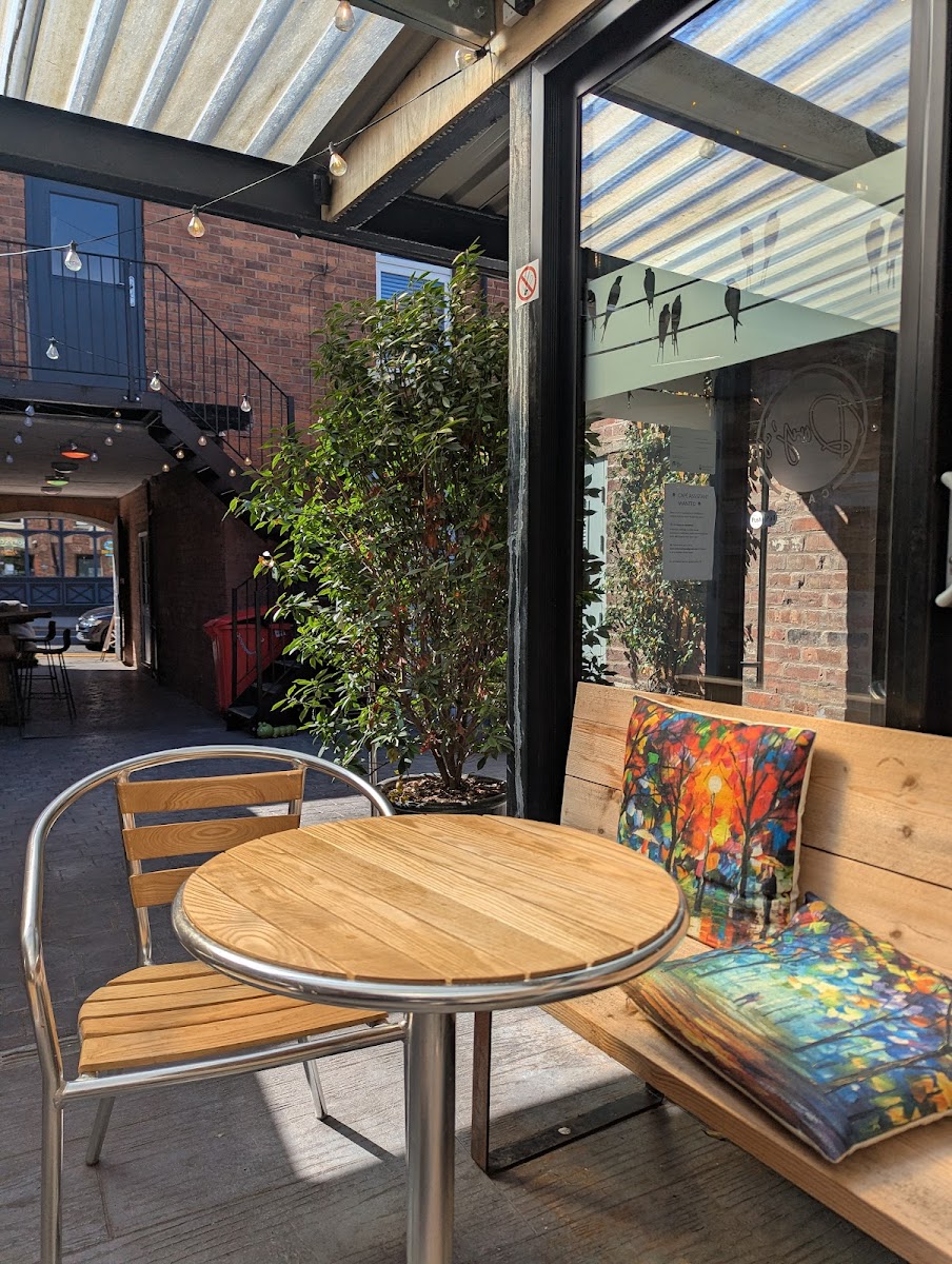 The cafe’s atmosphere is comfortably informal, with plenty of space both inside and out. The outdoor seating area stands out as a practical choice for families, wheelchair users, and anyone arriving with a stroller or scooter, making it especially handy for community gatherings or informal meetups. Soft lighting and a friendly buzz help keep the space lively without ever feeling rushed.