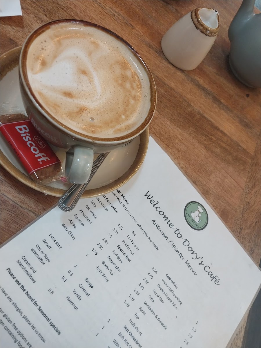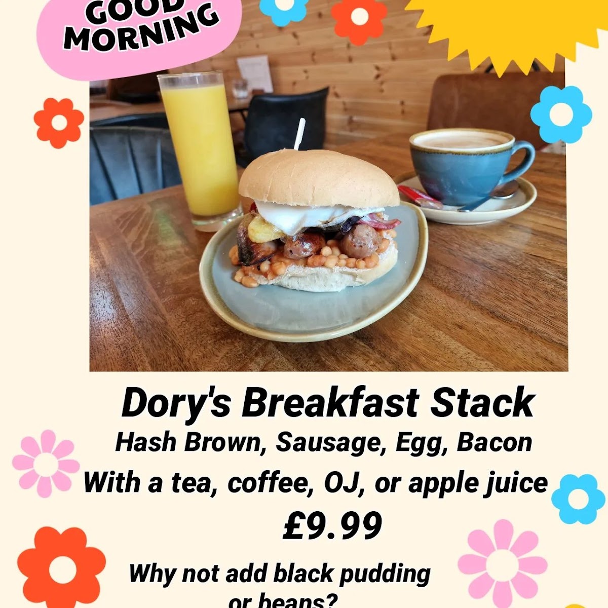The menu at Dory's Cafe features a variety of beverages and food items suitable for breakfast, coffee breaks, and light meals. Guests can select from an assortment of hot drinks including coffee options such as espresso, cappuccino, latte, flat white, Americano, mocha, and cortado, as well as teas like Earl Grey, peppermint, green tea, and fruit berry. Soft drinks such as Pepsi Max, Coke, Fanta, and 7up are also available.